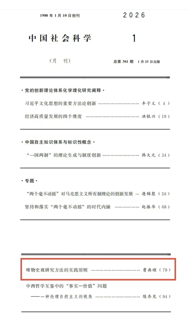 近日,我校马克思主义学院曹典顺教授的论文《唯物史观研究方法的实践原则》在人文社科领域顶级期刊《中国社会科学》2026年第1期正式发表。曹典顺教授作为唯一作者刊发论文,是我校在哲学研究领域的重要突破,进一步彰显了学校哲学学科建设的显著进展与学术影响力。
